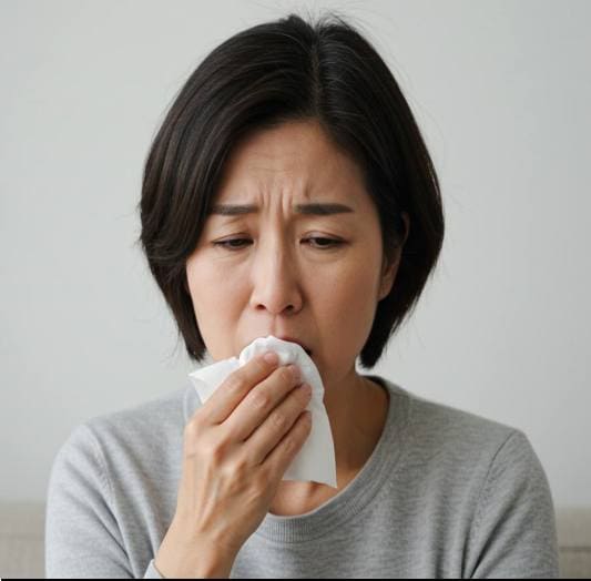 후비루의 가장 특징적인 증상은 코나 부비동에서 분비된 점액이 목 뒤로 넘어가면서 느껴지는 이물감입니다. 특히 점액이 끈적해지면 목이 간질거리거나 뭔가 걸린 듯한 불편한 증상이 심해질 수 있습니다.
